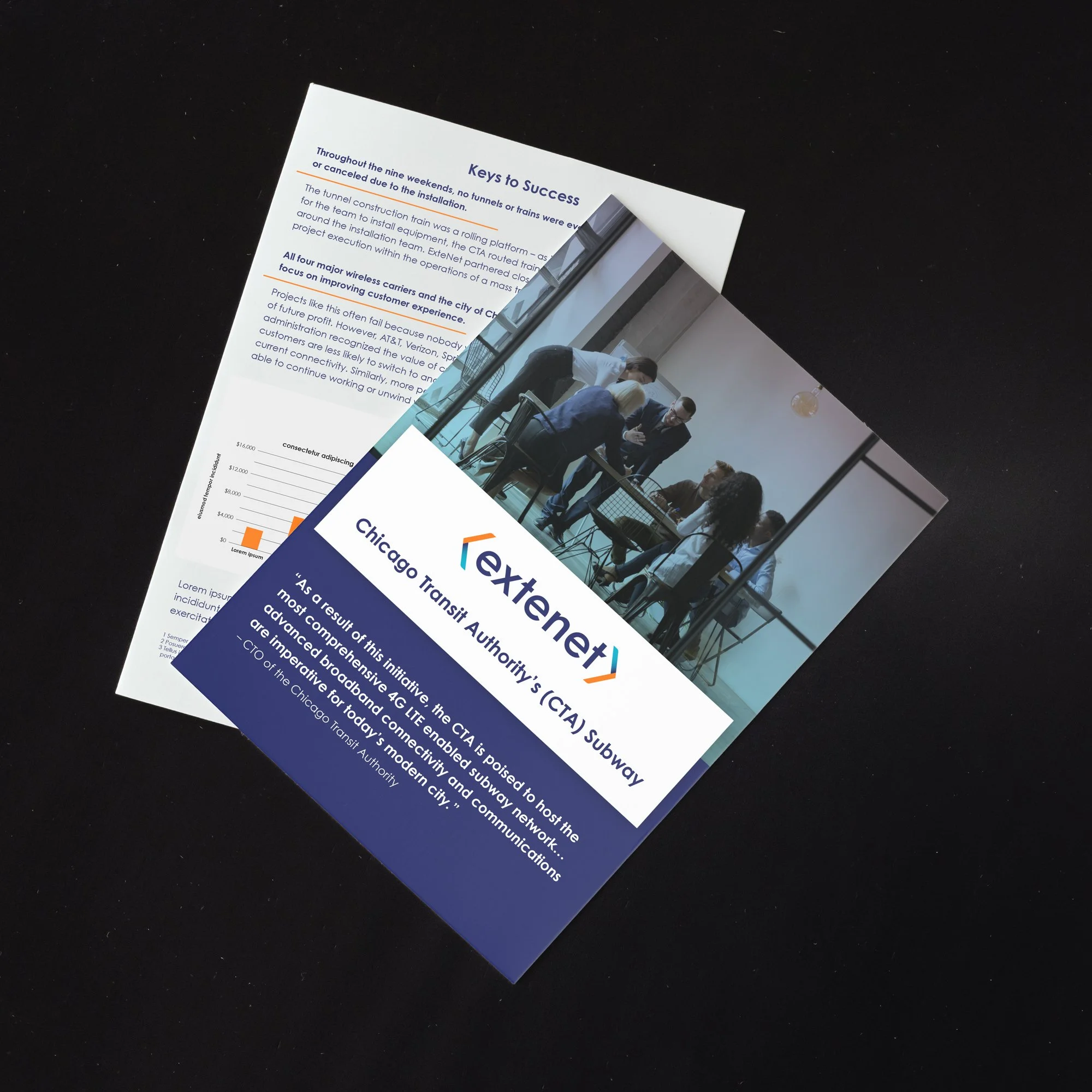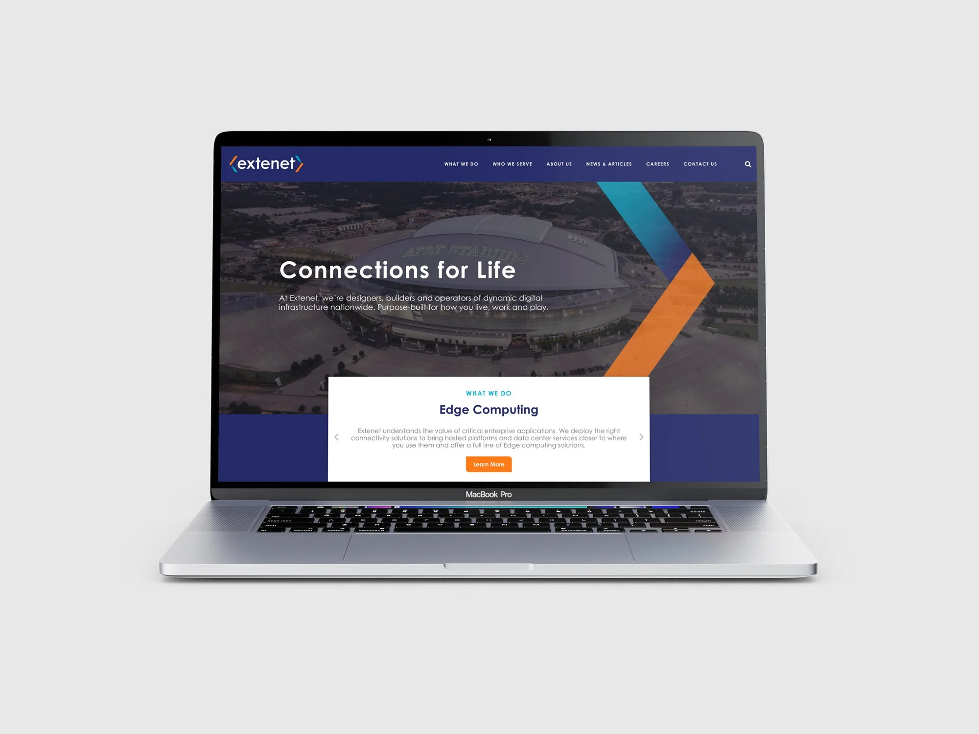 Extenet is a provider of communications infrastructure and services. This project consisted of creating new branding, a website, and other collateral. The website design used colors and elements such as the blue and orange bracket from the brand identity that was created.